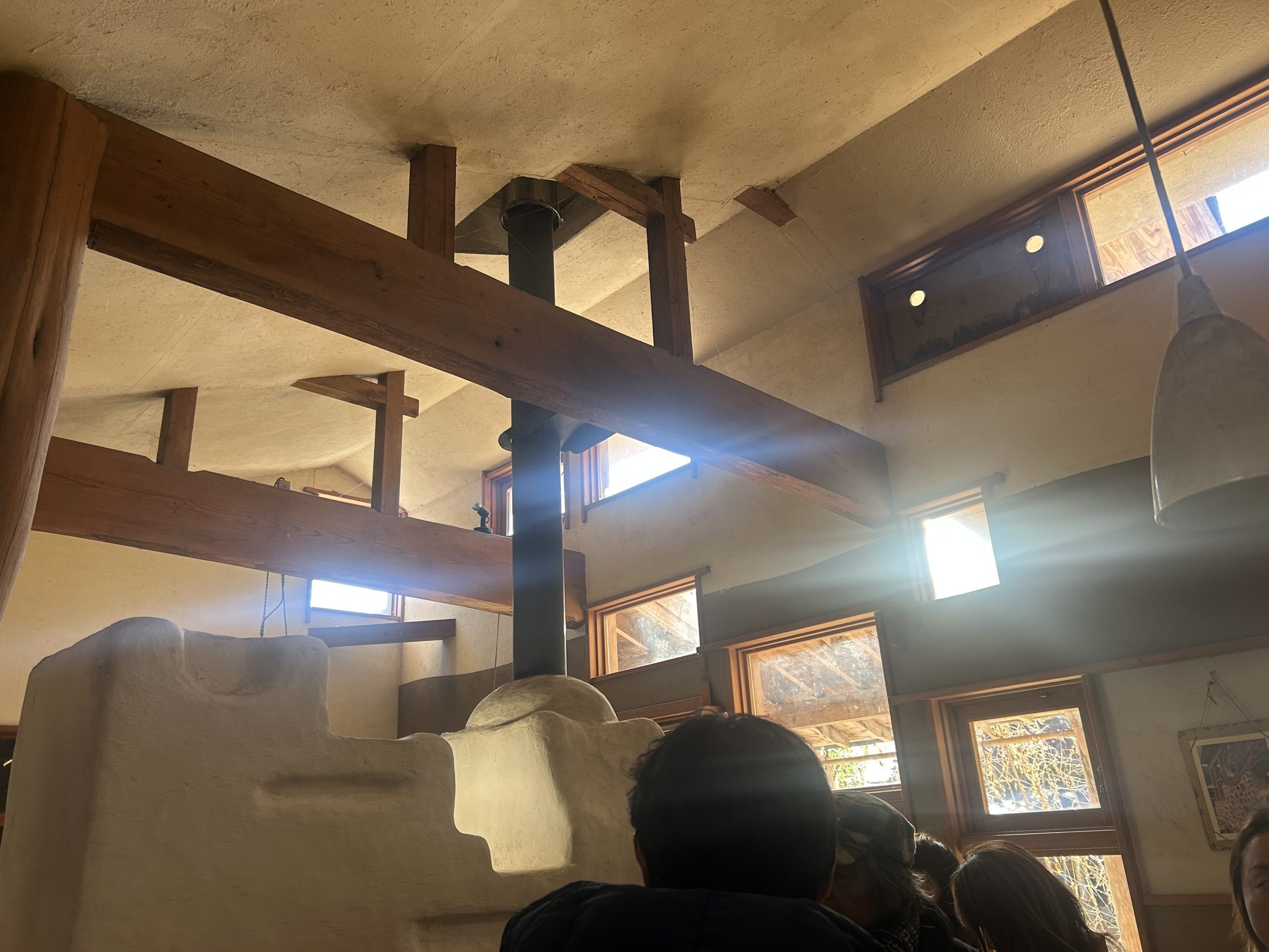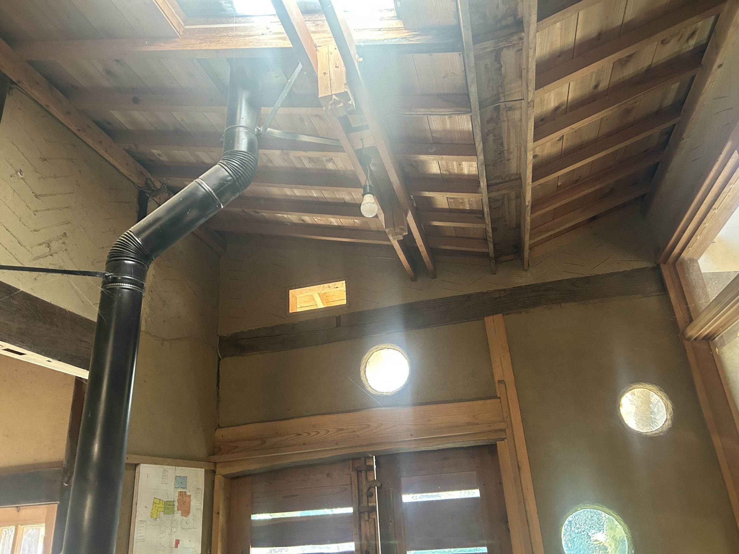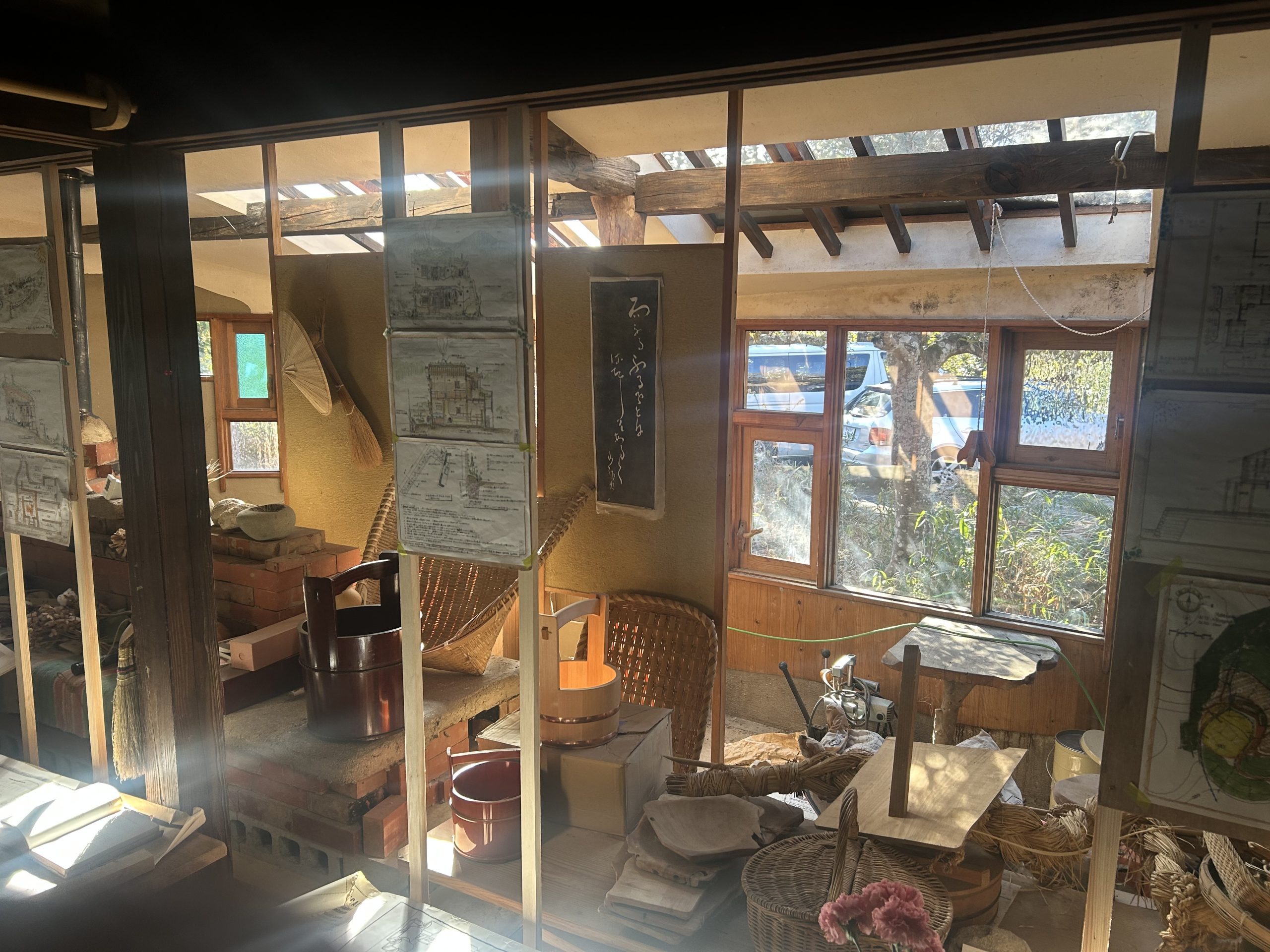 手作りの釜戸やロシアの蓄熱ストーブであるペチカが据えられ、五右衛門風呂や檜風呂も手作りで設えられていました。特に印象的だったのは、季節ごとの太陽の光を最大限に活用できるよう設計された窓の配置です。家づくりには、その地域に適した自然素材を使用することの重要性が強調されており、草屋根の上にはドラム缶が設置され、そこに溜まった雨水は太陽光で温められ、手作りの濾過システムを通じて家の中で大切に活用されていました。昨晩使用されたという五右衛門風呂のお湯は、翌日の昼頃まで温かさを保っていたのも驚きでした。