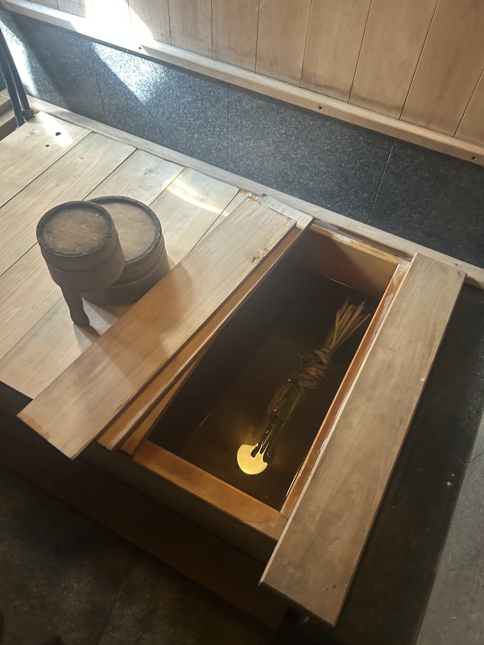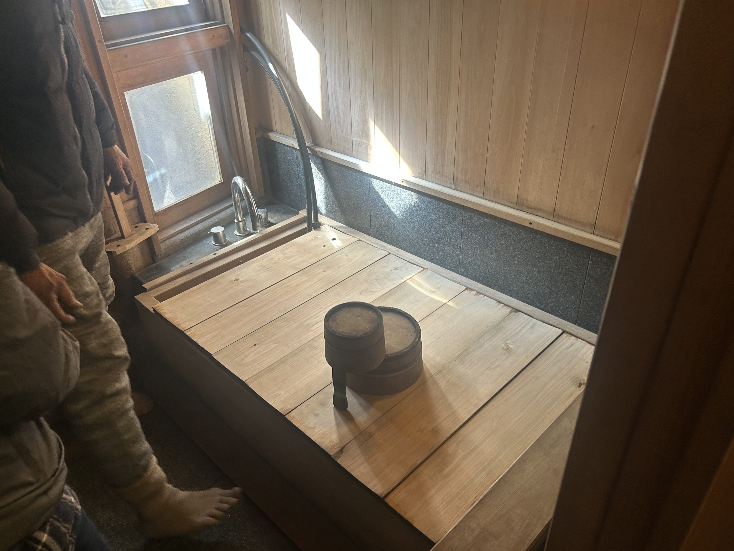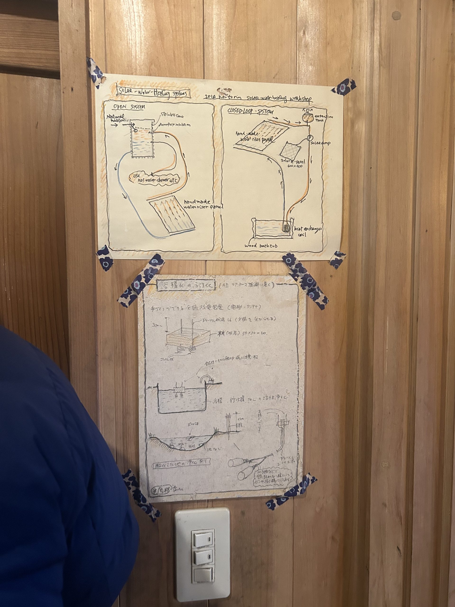 手作りの釜戸やロシアの蓄熱ストーブであるペチカが据えられ、五右衛門風呂や檜風呂も手作りで設えられていました。特に印象的だったのは、季節ごとの太陽の光を最大限に活用できるよう設計された窓の配置です。家づくりには、その地域に適した自然素材を使用することの重要性が強調されており、草屋根の上にはドラム缶が設置され、そこに溜まった雨水は太陽光で温められ、手作りの濾過システムを通じて家の中で大切に活用されていました。昨晩使用されたという五右衛門風呂のお湯は、翌日の昼頃まで温かさを保っていたのも驚きでした。