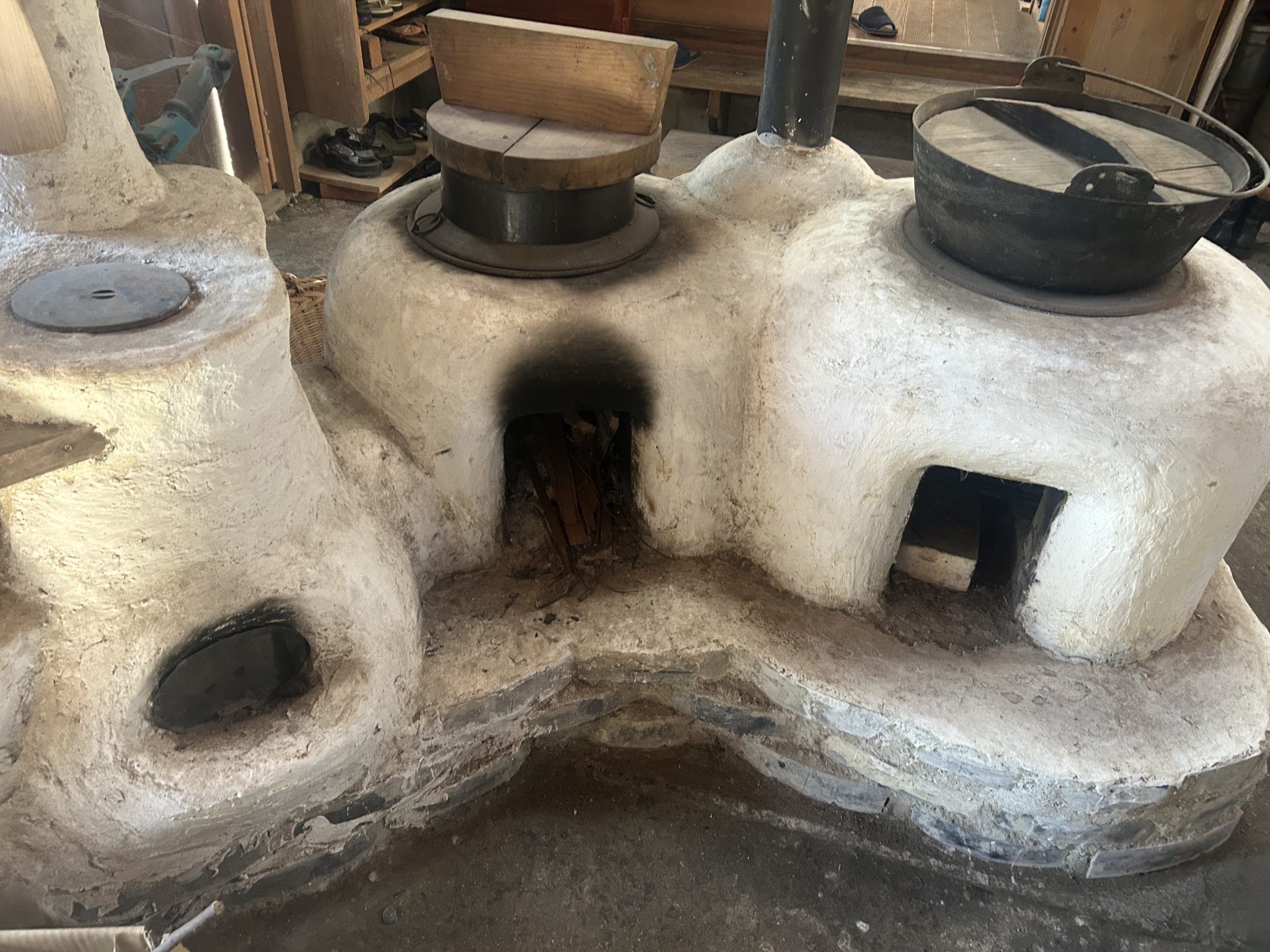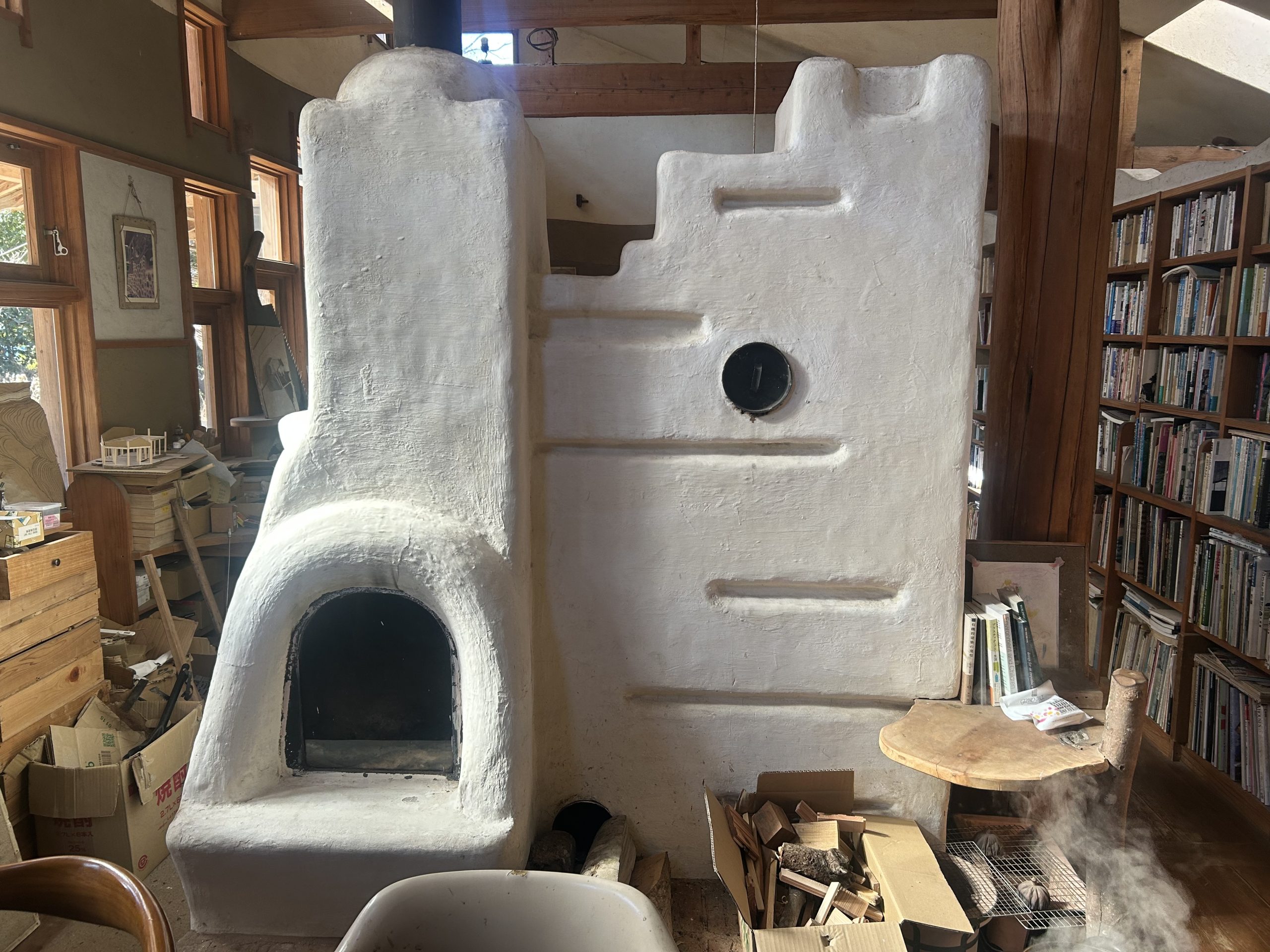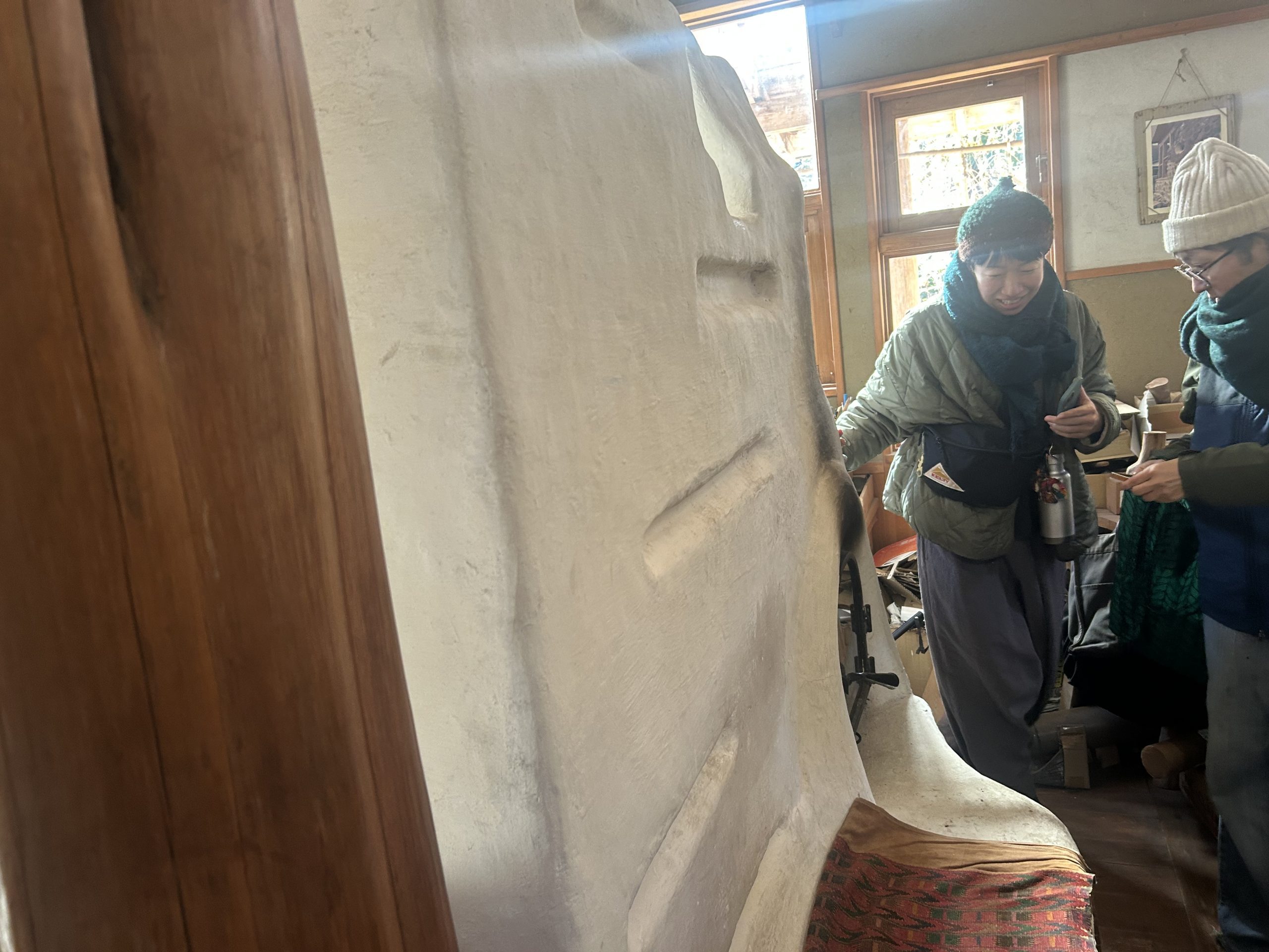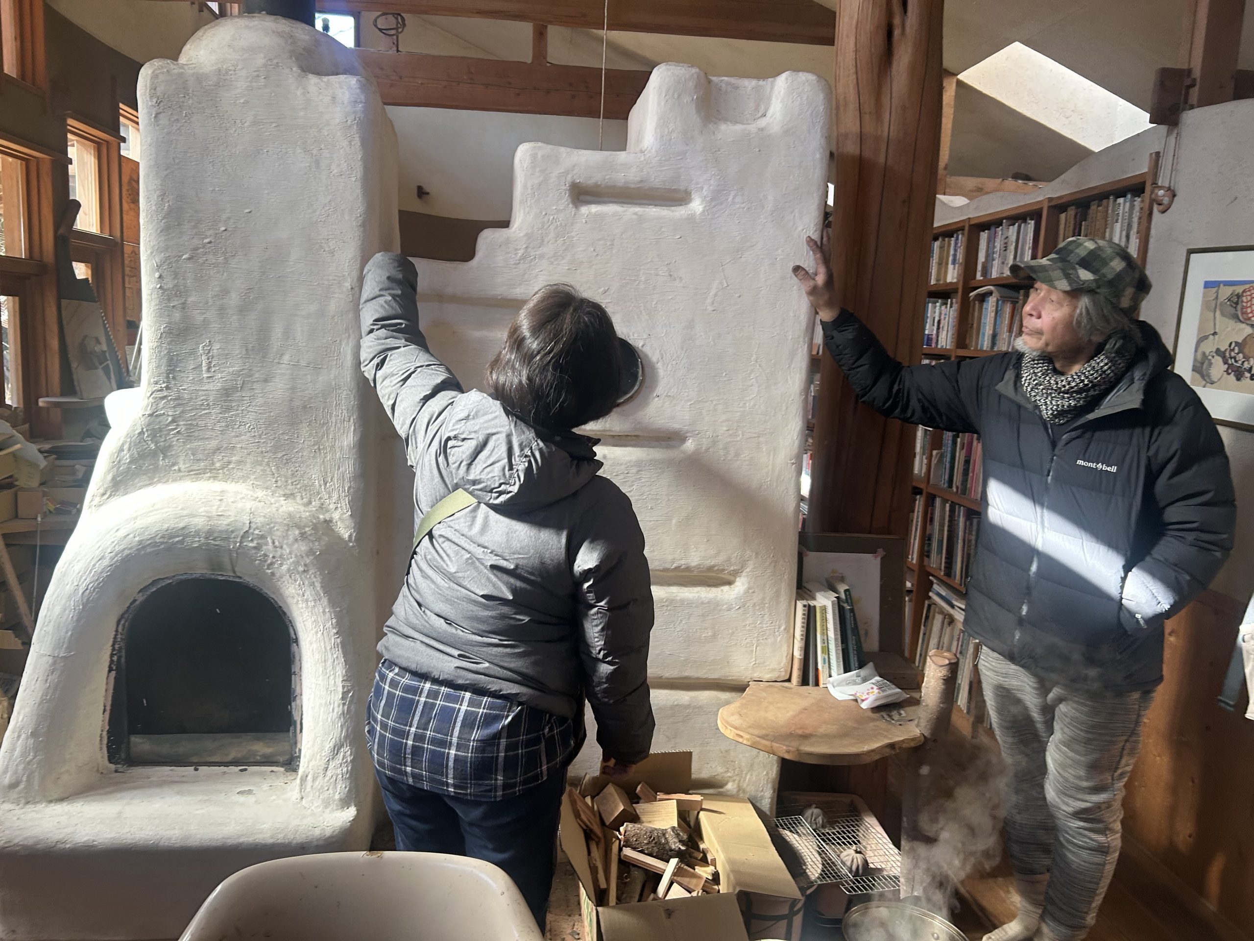 自然の形そのままの枝木が使われ、壁や部屋と部屋の間仕切りも漆喰によって自然な曲線が描かれていました。木の床下には土があり、これにより底冷えを防いでいるとのことです。特にペチカの存在は際立っており、その優しく柔らかな暖かさで部屋全体を快適な温度に保っていました。薪は太めのものを4本ほどで1日分が足りるそうで、断熱レンガで組み立てられたペチカは、外側を漆喰で固めることで傷防止の工夫もされています。薪を燃やす際には、一気に高温にせず、吸気口を閉じてじんわりと燃やすことでペチカを長持ちさせるとのことでした。そのため、1日の薪使用量は太い薪4本程度で済むそうです。ペチカ本体も煙突部分も、触れても火傷しない温度で、遠赤外線効果によって部屋全体を暖めていました。