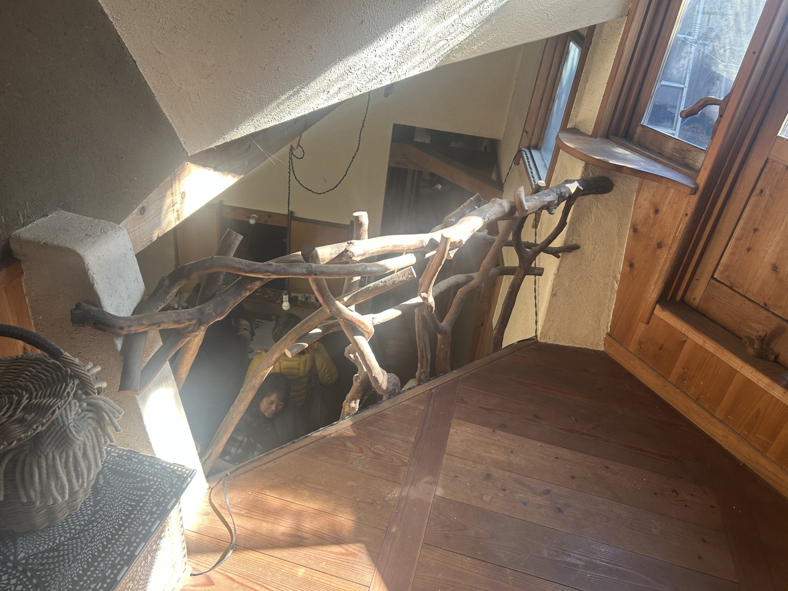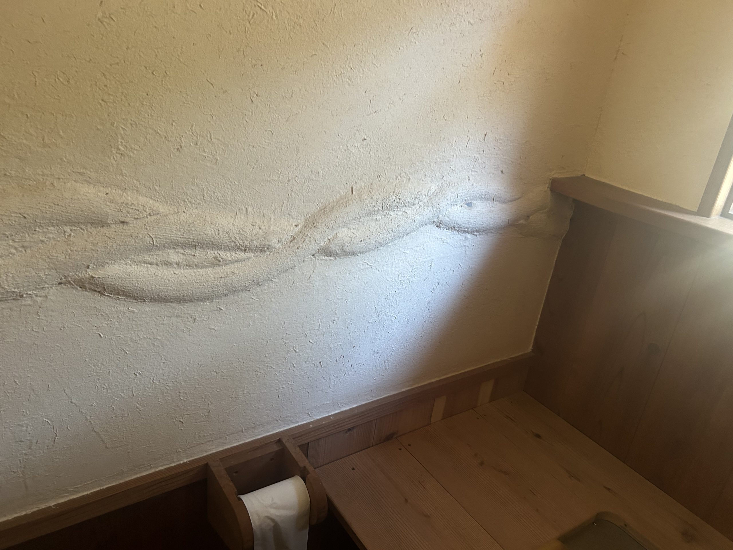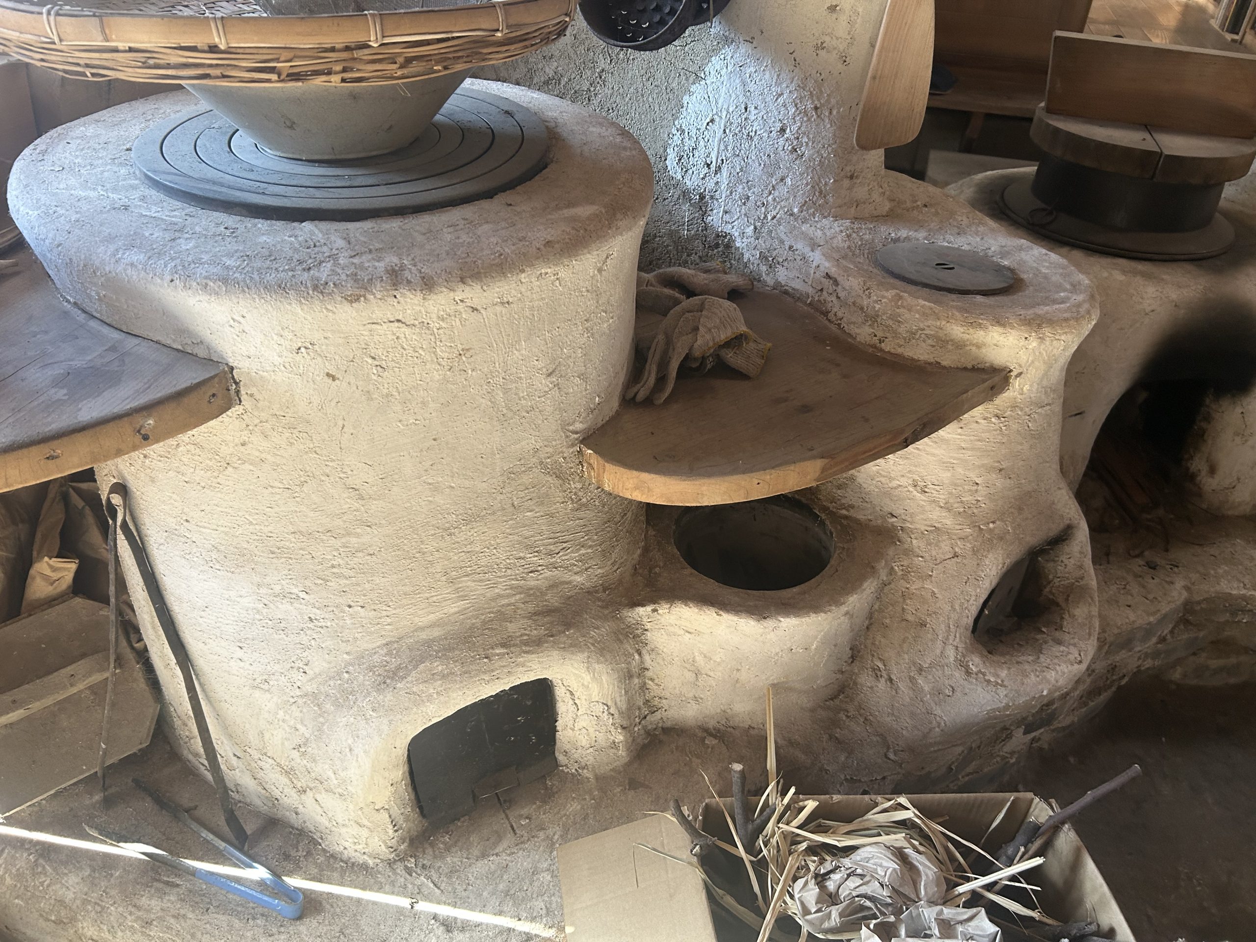 自然の形そのままの枝木が使われ、壁や部屋と部屋の間仕切りも漆喰によって自然な曲線が描かれていました。木の床下には土があり、これにより底冷えを防いでいるとのことです。特にペチカの存在は際立っており、その優しく柔らかな暖かさで部屋全体を快適な温度に保っていました。薪は太めのものを4本ほどで1日分が足りるそうで、断熱レンガで組み立てられたペチカは、外側を漆喰で固めることで傷防止の工夫もされています。薪を燃やす際には、一気に高温にせず、吸気口を閉じてじんわりと燃やすことでペチカを長持ちさせるとのことでした。そのため、1日の薪使用量は太い薪4本程度で済むそうです。ペチカ本体も煙突部分も、触れても火傷しない温度で、遠赤外線効果によって部屋全体を暖めていました。