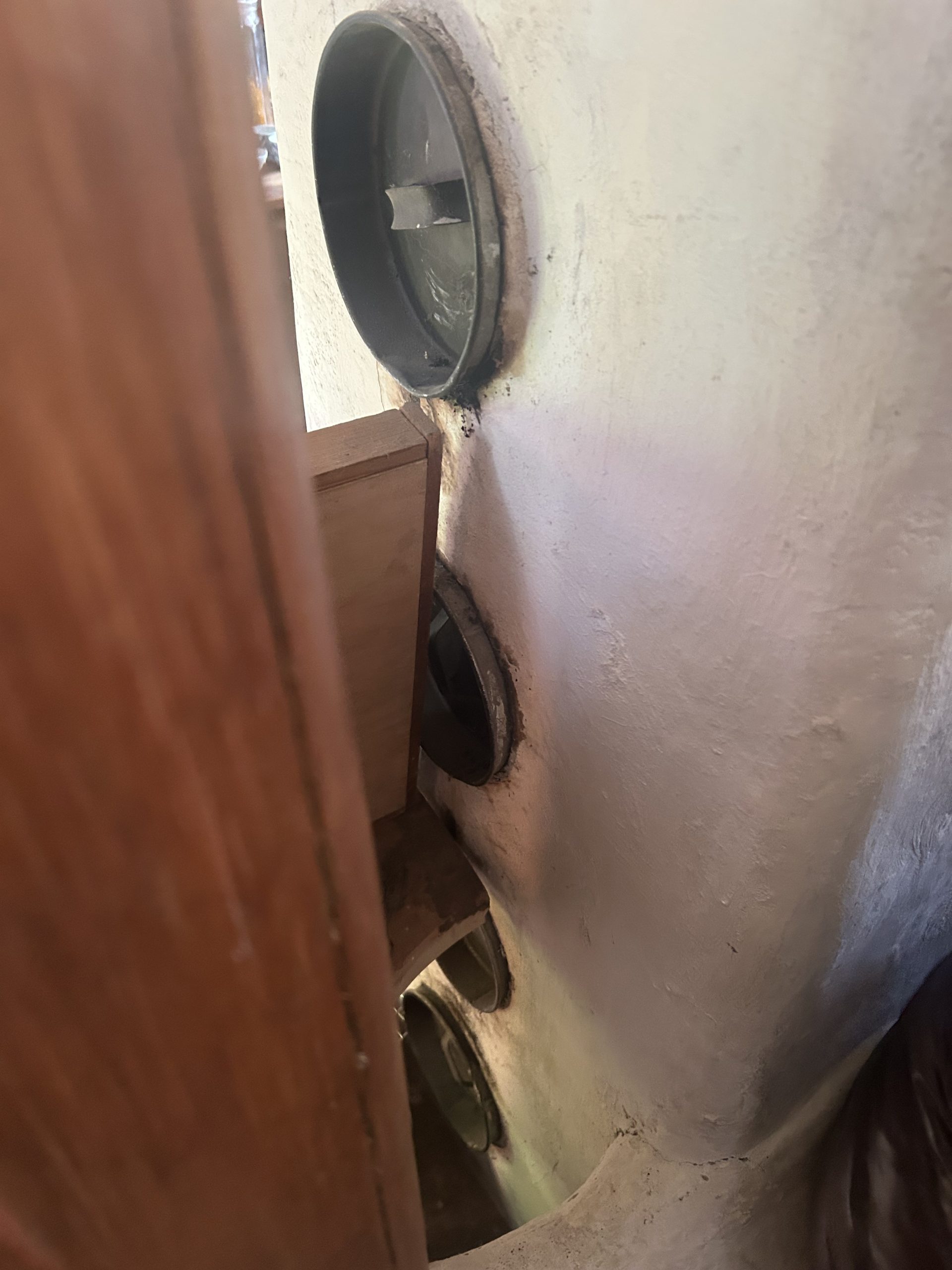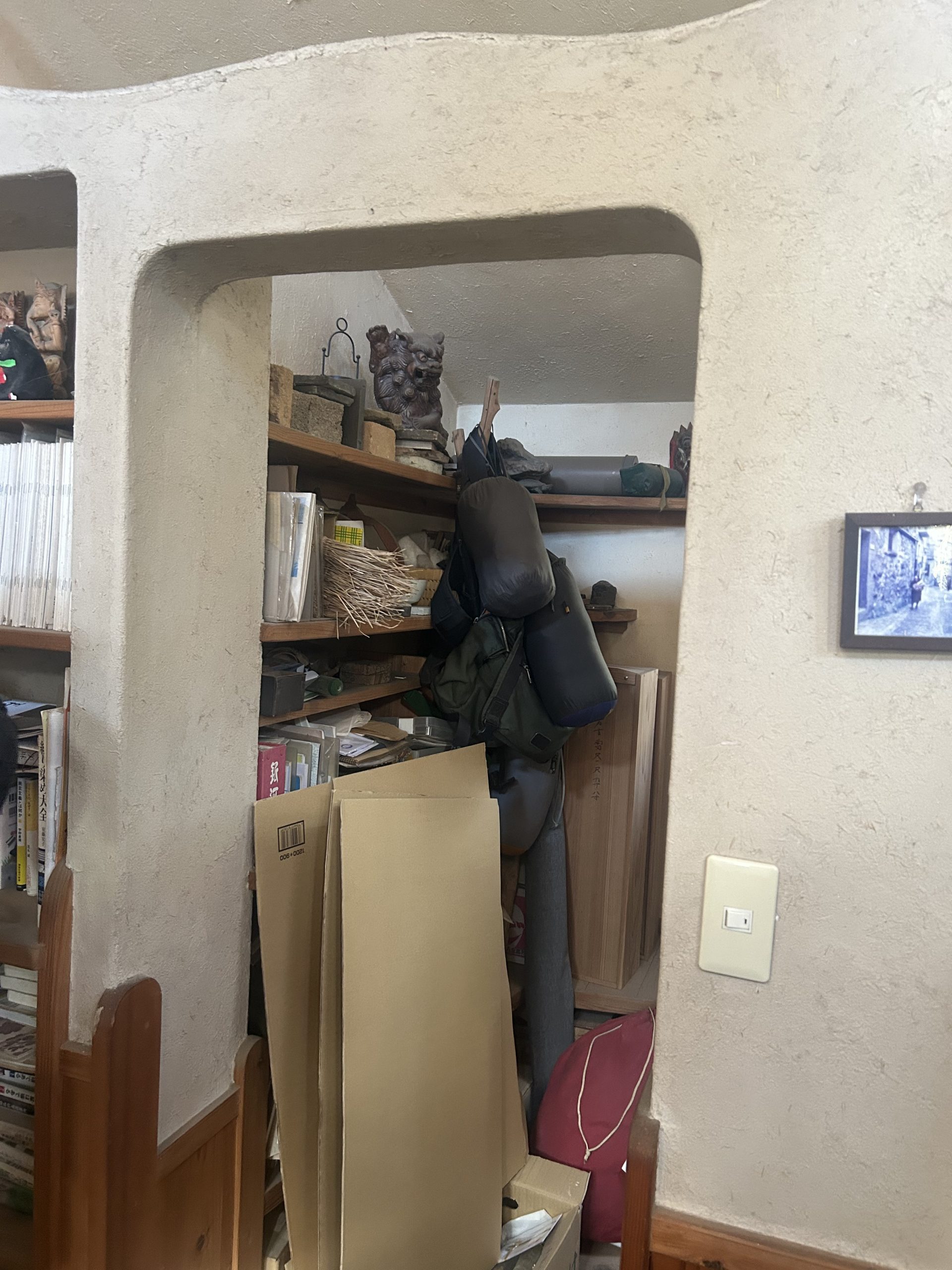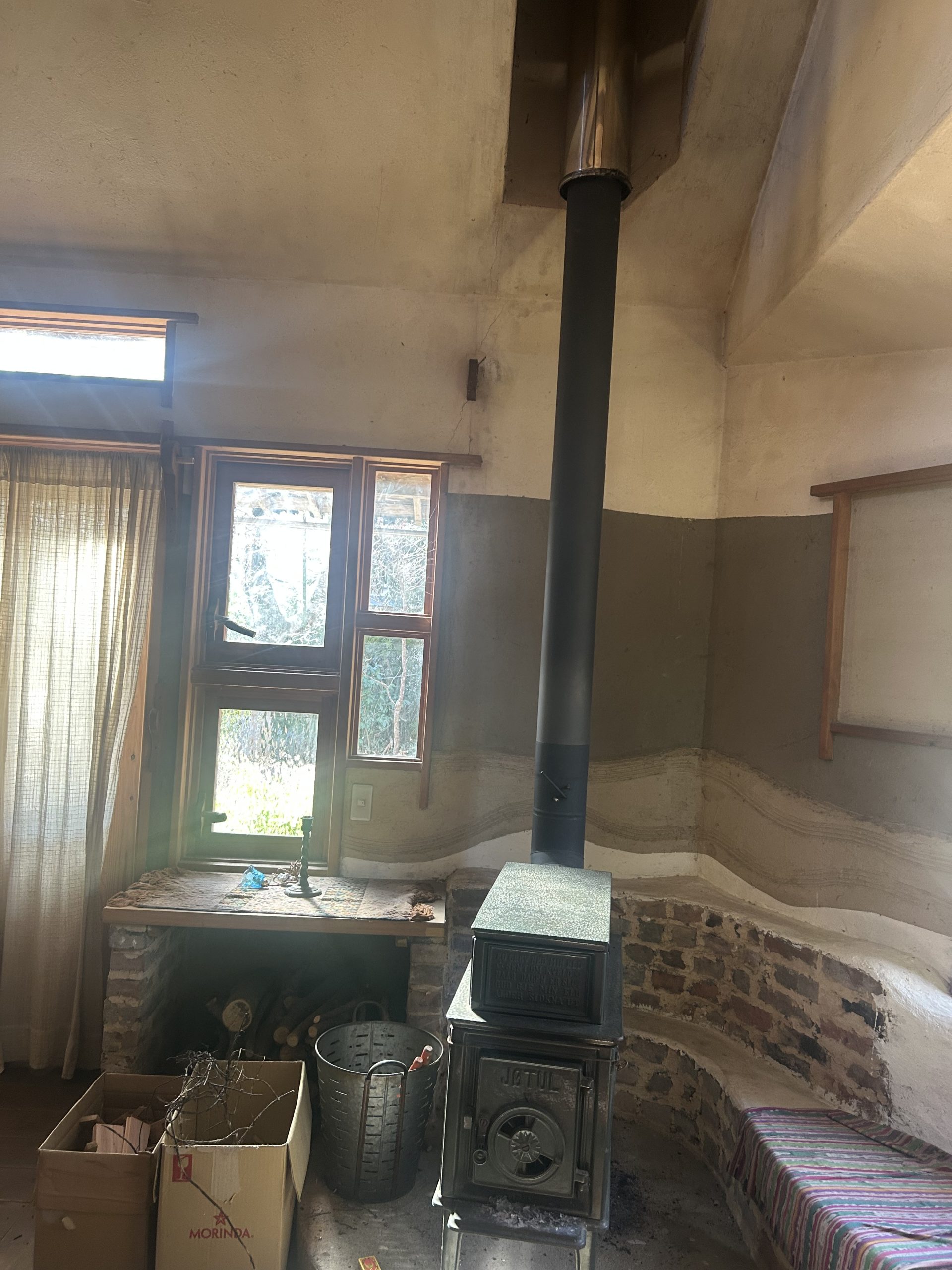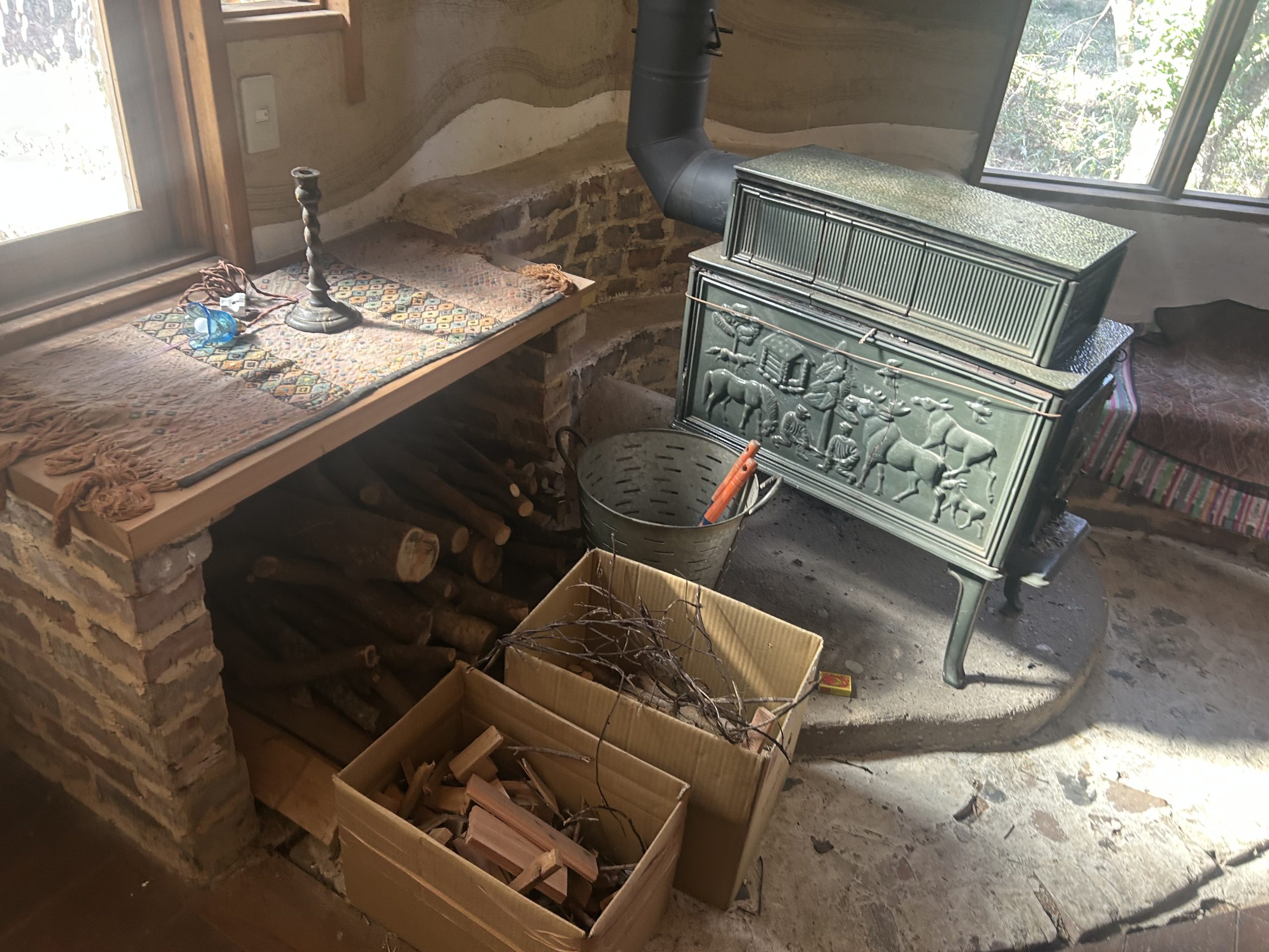 自然の形そのままの枝木が使われ、壁や部屋と部屋の間仕切りも漆喰によって自然な曲線が描かれていました。木の床下には土があり、これにより底冷えを防いでいるとのことです。特にペチカの存在は際立っており、その優しく柔らかな暖かさで部屋全体を快適な温度に保っていました。薪は太めのものを4本ほどで1日分が足りるそうで、断熱レンガで組み立てられたペチカは、外側を漆喰で固めることで傷防止の工夫もされています。薪を燃やす際には、一気に高温にせず、吸気口を閉じてじんわりと燃やすことでペチカを長持ちさせるとのことでした。そのため、1日の薪使用量は太い薪4本程度で済むそうです。ペチカ本体も煙突部分も、触れても火傷しない温度で、遠赤外線効果によって部屋全体を暖めていました。