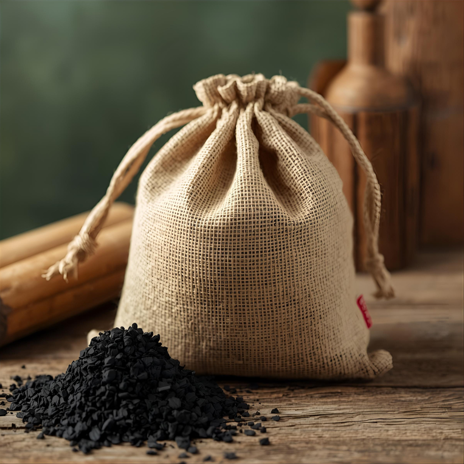 竹林整備で出た竹を炭化し、麻袋に包んだ自然素材100%の竹炭パック。